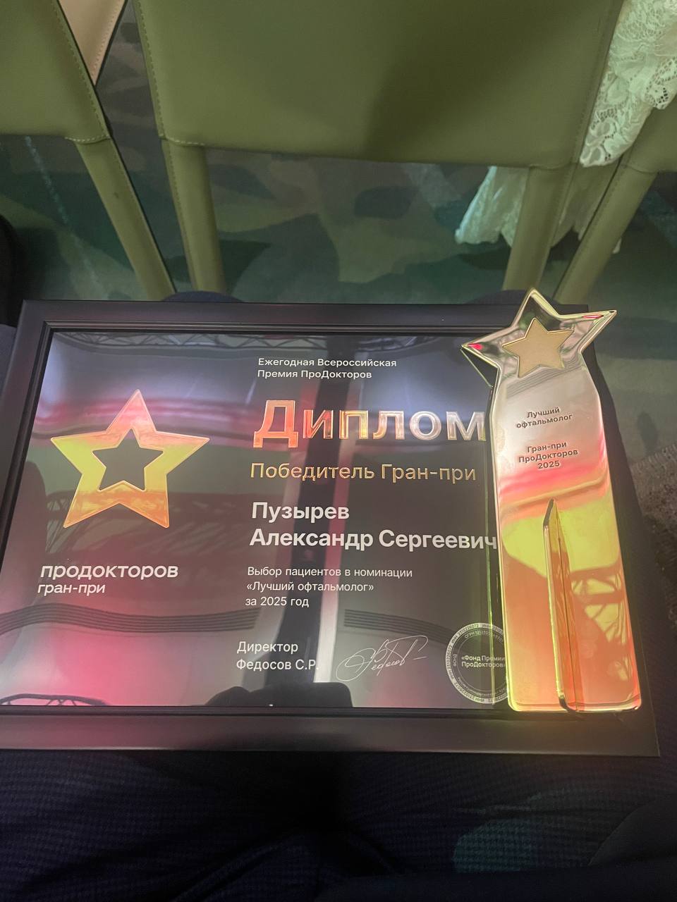 21 ноября в Сочи на Федеральной территории Сириус прошла церемония награждения победителей Гран-при премии "ПроДокторов", где были названы имена лучших врачей страны, среди которых победителем в номинации "Лучший офтальмолог России" стал - Пузырев Александр Сергеевич!